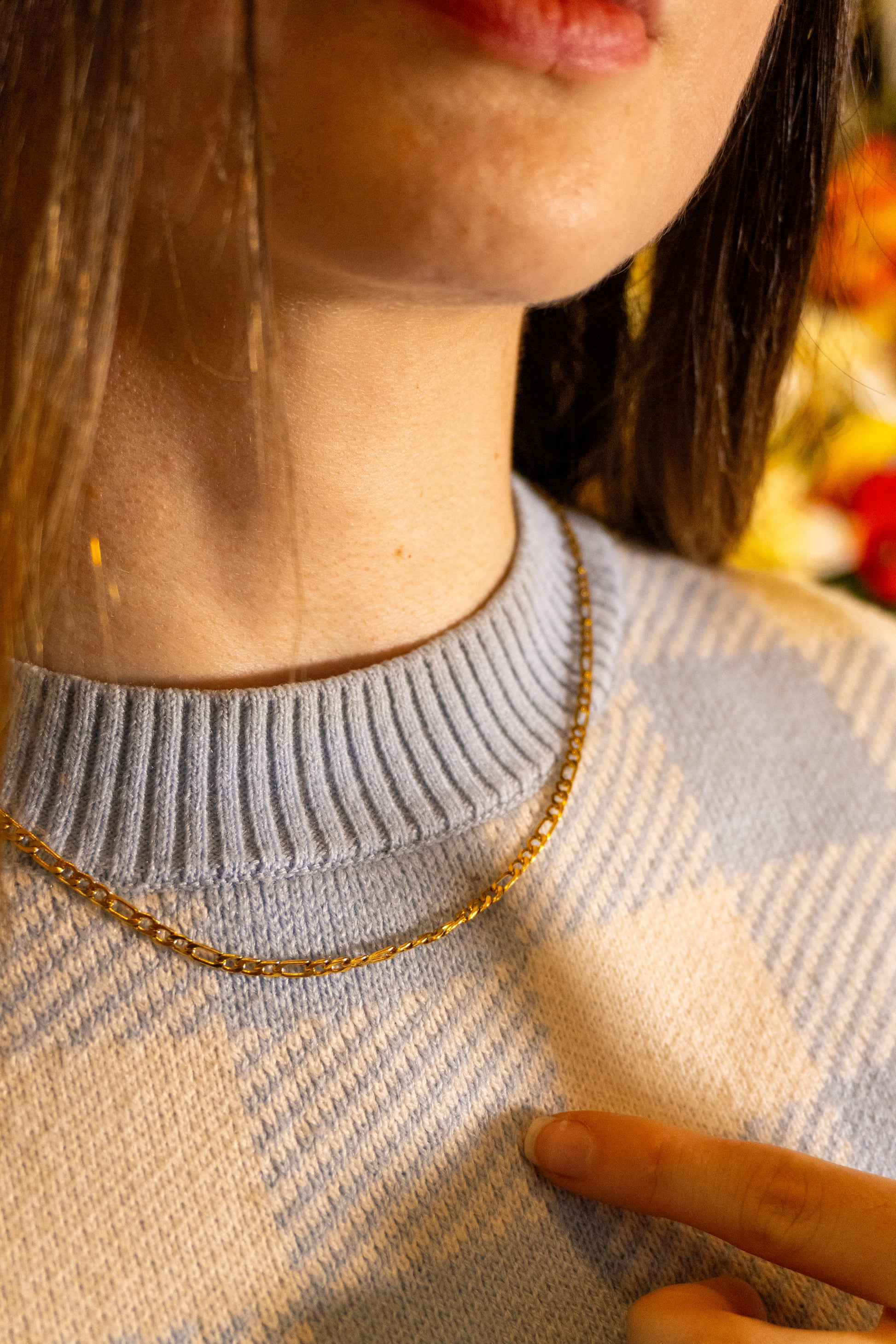 Cadena elaborada en oro laminado de 18K, diseñada para resistir todo tipo de ambiente: mar, piscinas y sudoración, sin perder su brillo ni elegancia.